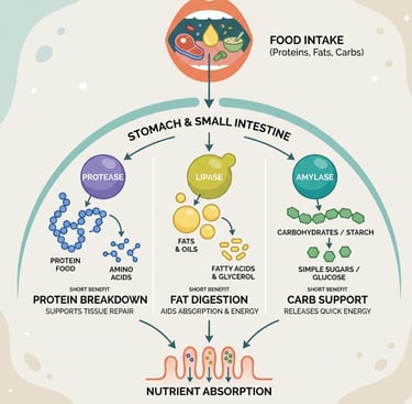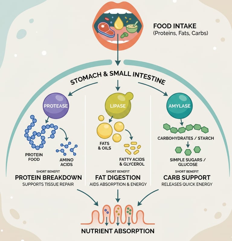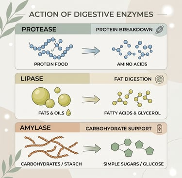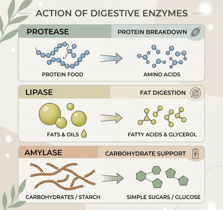 Sources / References: National Institutes of Health (NIH). Digestive enzymes and nutrient absorption. / Harvard Health Publishing. Digestive health and enzyme function. / Cleveland Clinic. Bloating and digestive discomfort. / Mayo Clinic. Indigestion and causes. / Journal of Gastroenterology. Role of digestive enzymes in gut health.